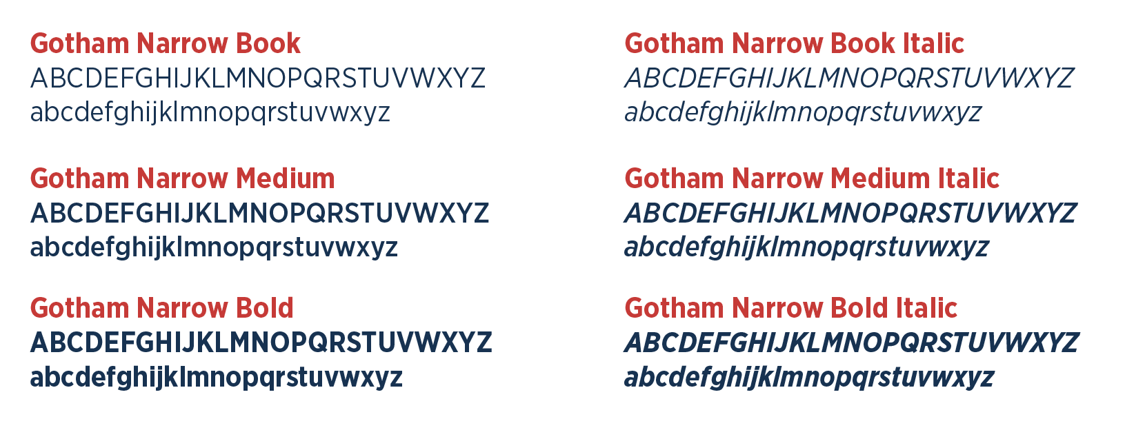 The Gotham Narrow typeface has been selected to use on all branded material for which the artwork is generated. The Arial typeface has been selected use on web communications. Any member of these typeface families may be used (light, roman, medium, bold, italic, etc.)